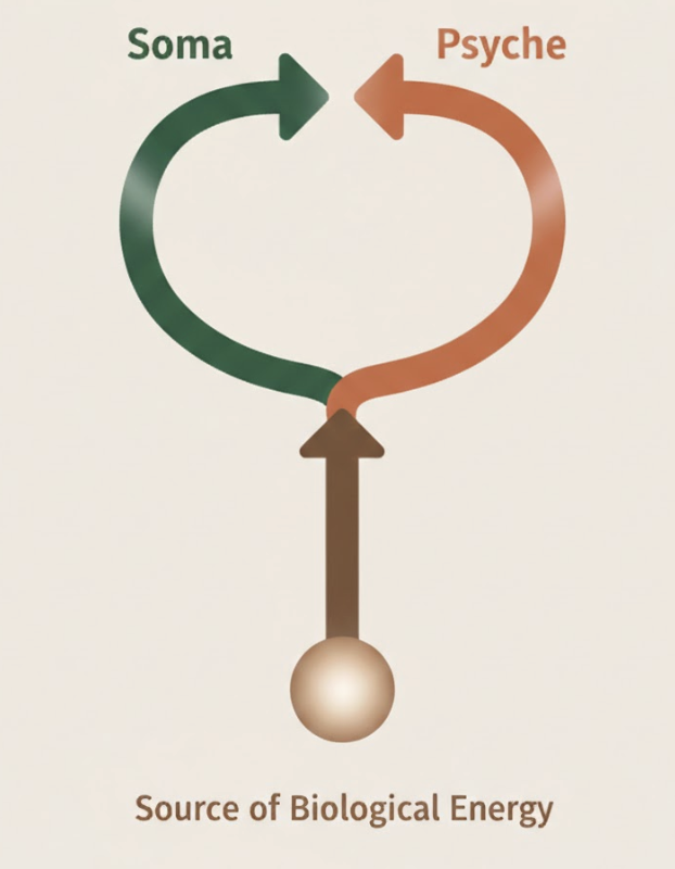 We attend to both the mind and body, because what is expressed on the outside in the muscular armor is identical to what has happened on the inside. That is to say, psyche (mind) and soma (body) are functionally identical.